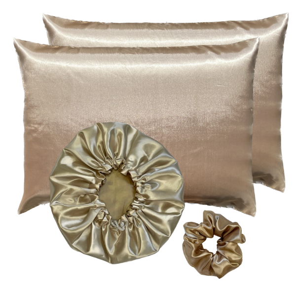 O kit contém: 2 Fronha de cetim + 1 Touca de cetim dupla face com regulador + 1 Scrunchie de cetim.